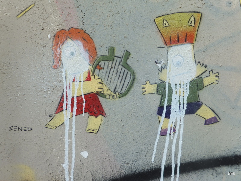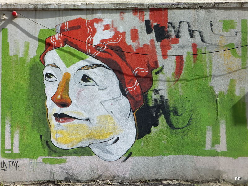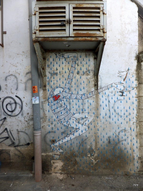 אהבתי את מאבק האיתנים של הדמויות הכחולות של KLONE, מראשוני הציירים ברחוב. בתמונה – דמות אחת מתוך מקבץ של דמויות. אני אוהבת את העבודה הזאת כי יש בה עצמה ואין בה שמץ של התיפיפות. יש לדמויות שיניים חשופות והן מצטיירות לי כ"הארד קור" של הגרפיטי. אולי זו הסיבה שהציור ספג את הריסוס האגרסיבי והמכוער מעליו. דמויות רבות של קלון מעטרות קירות בתל אביב, ורבות מהן צבעוניות מאלה ויפות מהן. אבל דווקא בדמויות הראשוניות האלה יש איזו עזות של הבעה.