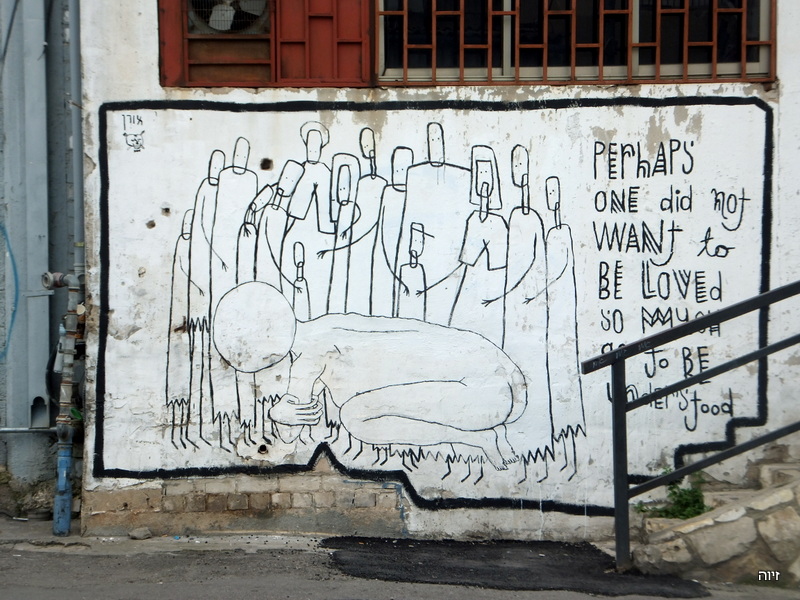 פומה, מוותיקות אמני הרחוב, מביאה אתה משהו מאוד ייחודי ועדין. היא מציירת במכחול קו מאוד רגיש, דבר יוצא דופן בתרבות הגרפיטי. אני חושבת שזהו ציור אנטי-גרפיטי במהותו, אף על פי שבתוכנו הוא מאוד מחובר אל הרחוב. כמה פעמים עברתי לידו ברחוב ולא שמתי לב אליו עד שאלישבע התייחסה אליו. כשאני מסתכלת בתמונה אני רואה איזה קומפוזיציה יפה נוצרה עם כתמי החלודה, הצבע, רשת הקווים של החלון ויתר האלמנטים שבקיר. אבל מעל לכול – התינוק בפינה והאיש המבוגר העייף צובטים בלב.