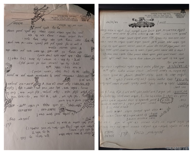 | המכתבים של קרן לבני הנוער. מימין – תכנית הטיול לערבה, ומשמאל – תכנית הטיול לחרמון. |